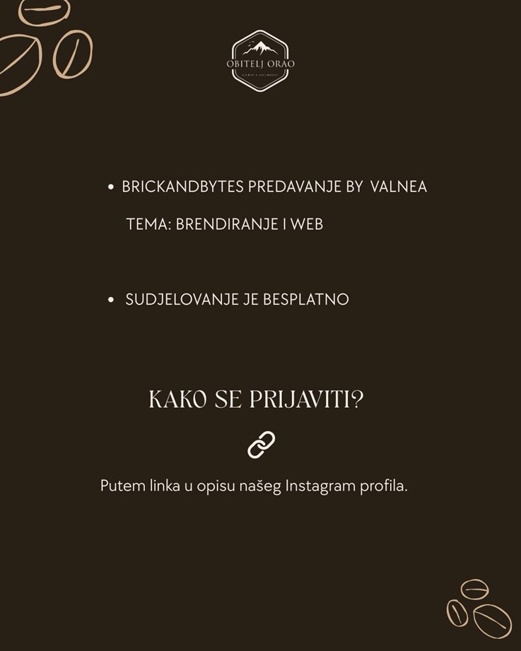 Gošća susreta je Valnea iz Brick and Bitesa, koja će sudionicama približiti teme brendiranja i web prisutnosti, s naglaskom na praktične savjete koje je moguće odmah primijeniti u poslovanju – od jasnog pozicioniranja brenda do učinkovitog online nastupa.