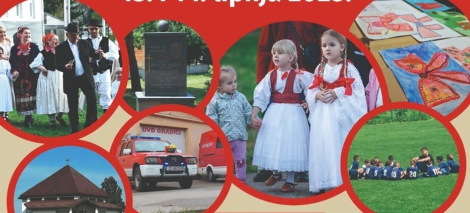 12:00 sati – Etno likovna kolonija za djecu i mlade KUD-a Gradići, ispred stare hiže kod škole (potrebne prijave do 12. lipnja na broj 098 781 881). Sudionike očekuje nagrade, topli obrok, piće, druženje s profesionalnim slikarima, kulturni program.