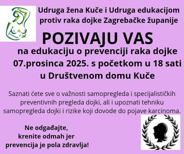 Udruga žena Kuča u suradnji s Udrugom Edukacijom protiv raka dojke Zagrebačke županije pozivaju na edukaciju o prevenciji raka dojke u nedjelju 7. prosinca u 18:00 sati u Društveni dom Kuče.