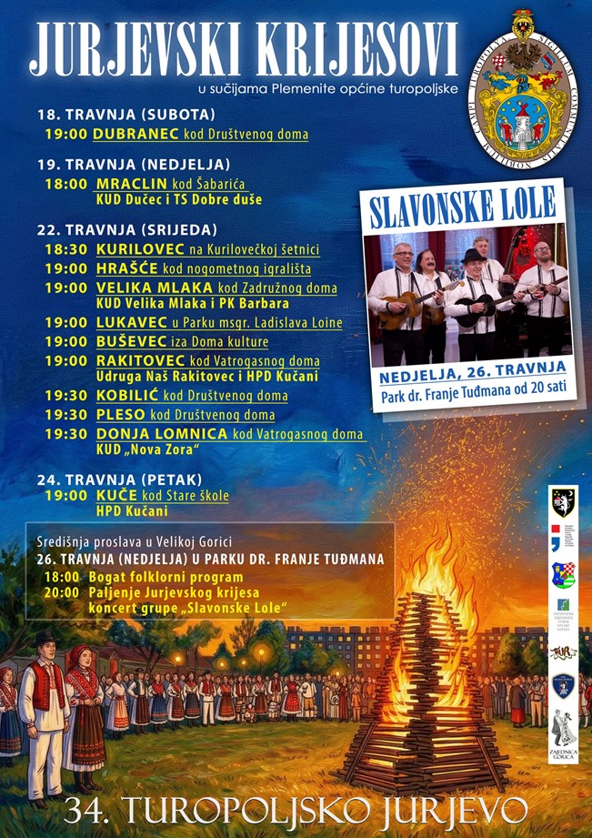Tradicionalno paljenje Jurjevskih krijesova u sučijama POT-a započelo je ovih dana. Krijesovi su tako već gorjeli u Dubrancu i Mraclinu, a večeras se pale u većini naselja. Programi proslave Jurjeva će se večeras održati u Kurilovcu, Hrašću, Velikoj Mlaki, Lukavcu, Buševcu, Rakitovcu, Kobiliću, Plesu i Donjoj Lomnici. Program se nastavlja i u petak, 24. travnja, u Kučama, a središnja proslava održat će se u nedjelju u Parku dr. Franje Tuđmana.