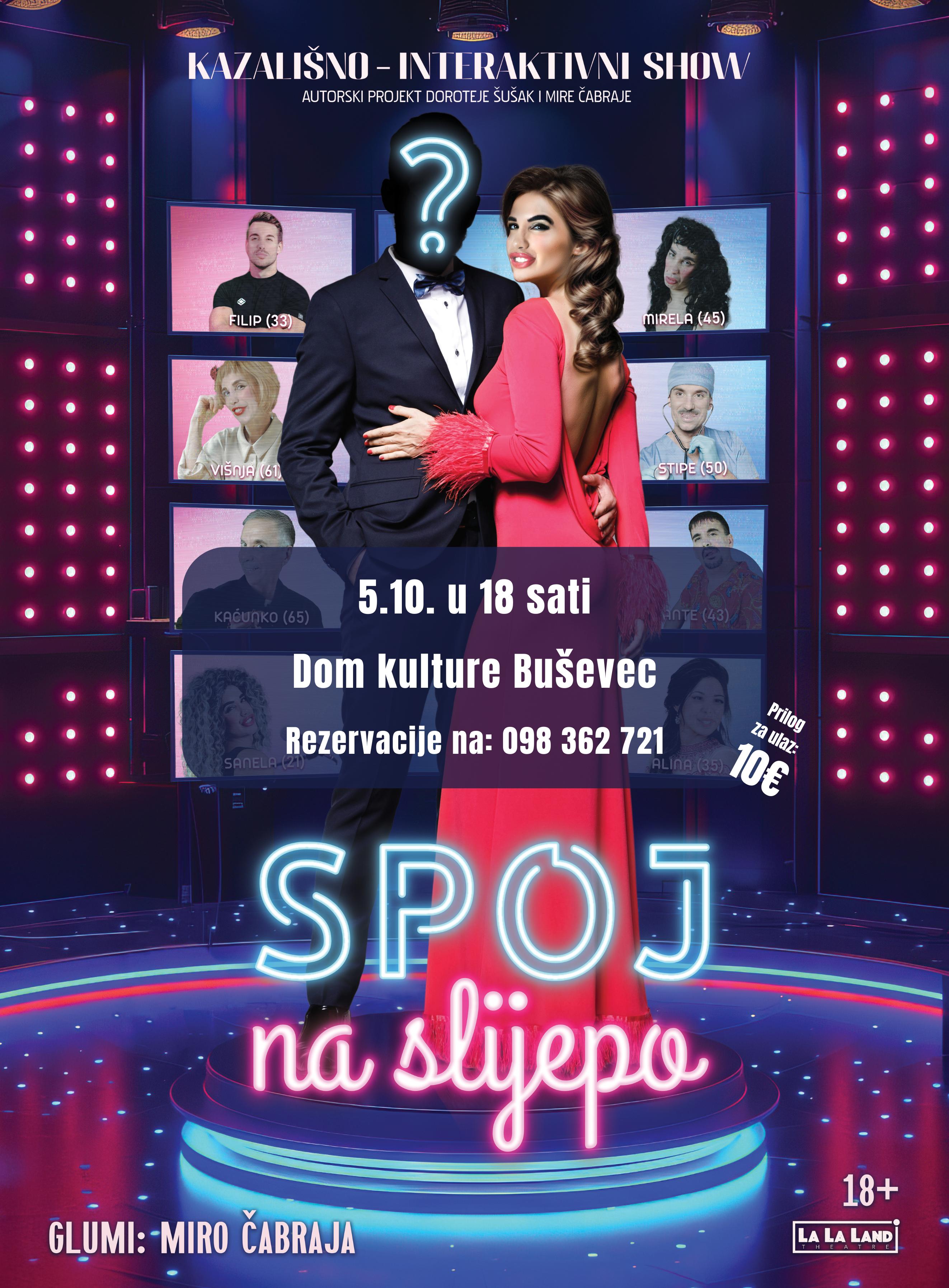 U nedjelju 5. listopada 2025., u 18:00 sati, publika će ponovno imati priliku sudjelovati u jedinstvenom spoju zabave, provokacije i interakcije, koji će se održati u Domu kulture Buševec. Stiže predstava "Spoj na slijepo" kazališno-interaktivni show Mire Čabraje.