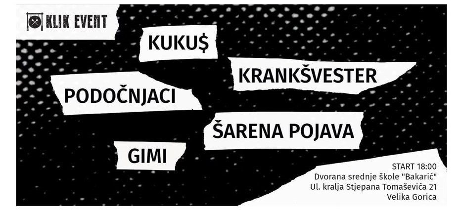 Dvorana velikogoričke Srednje strukovne škole u subotu 25. listopada "raspalit" će glazbeno putovanje koje je najlakše staviti pod nazivnik – „a sada nešto za mlade!“. Od trapa, hip-hopa, grungea, s puno „tvrdog“ zvuka, hrvatskog housa do pjesama koje nećete čuti van koncertnih dvorana zbog čega događaj ima oznaku „16+“. KUKU$, Krankšvester, Podočnjaci, Šarena Pojava i Gimi čekaju vas u „Bakariću“!