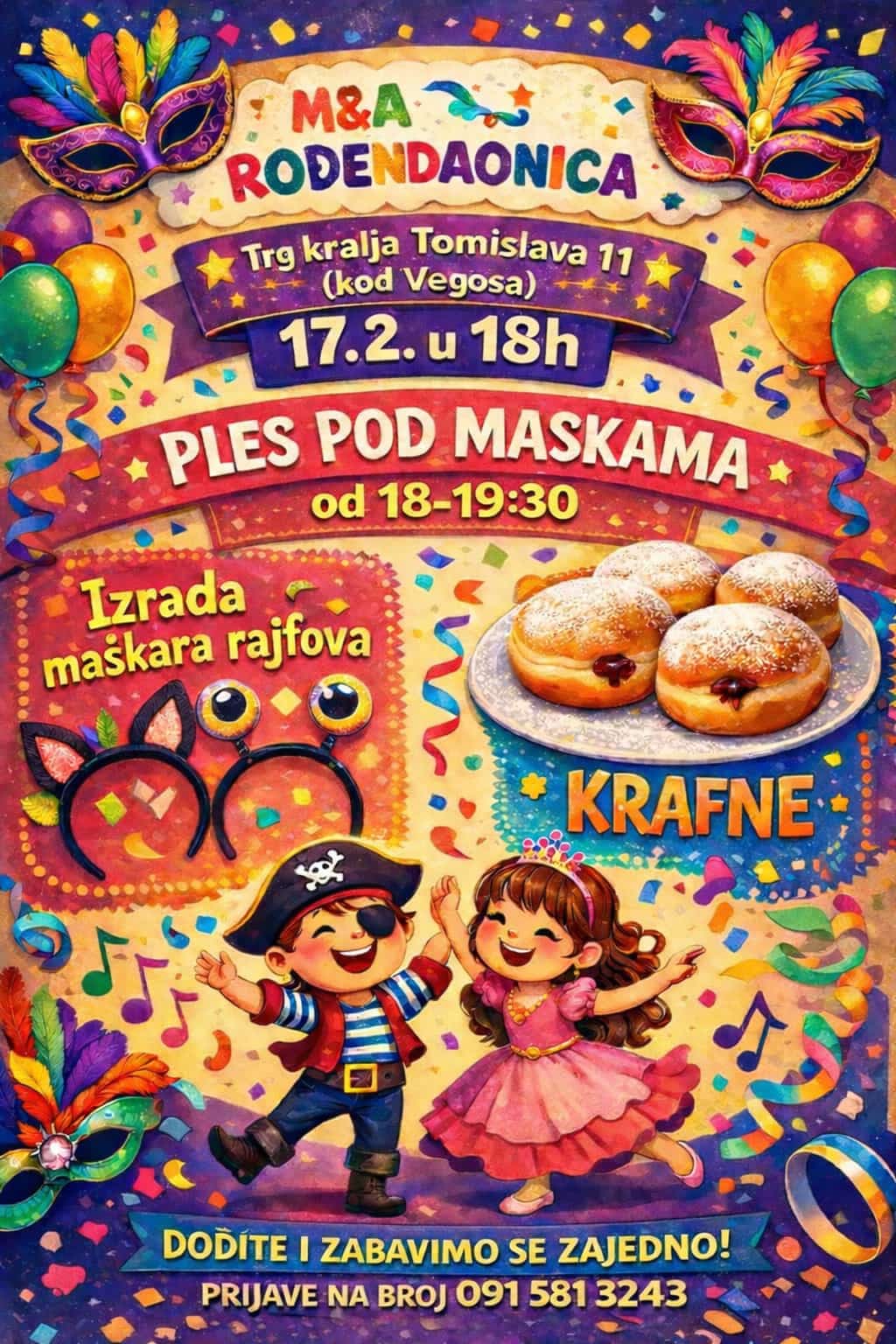 Kreativni tim „M&A” rođendaonice pripremio je prigodno događanje za velikogoričke mališane. Na sam pokladni utorak, 17. veljače, u prostorijama rođendaonice na Trgu kralja Tomislava 11, održat će se „Ples pod maskama” za najmlađe sugrađane. Male maškare imat će prilike sami kreirati i izraditi dodatke za kostime, uživati u plesu i zabavi i zasladiti se ukusnim krafnama.