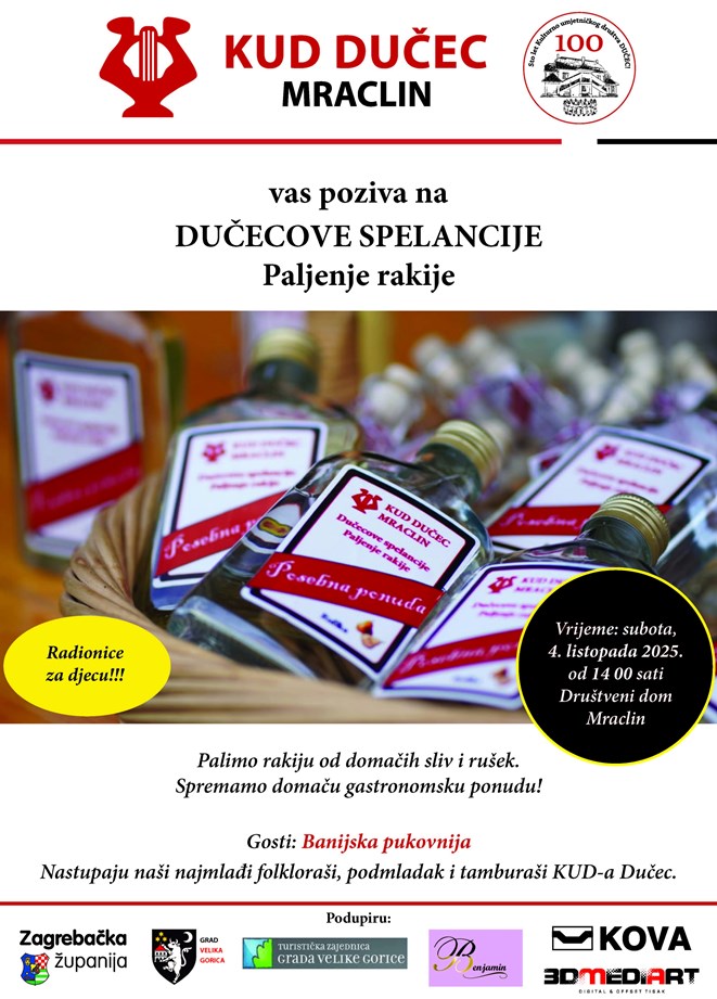 Kako se nekada palila rakija od domaćih šljiva i krušaka Mraclinci čuvaju od zaborava. Tradicionalna jesenska manifestacija Dučecove spelancije - paljenje rakije organizirana je u subotu 4. listopada od 14:00 sati u Društvenom domu Mraclin.
