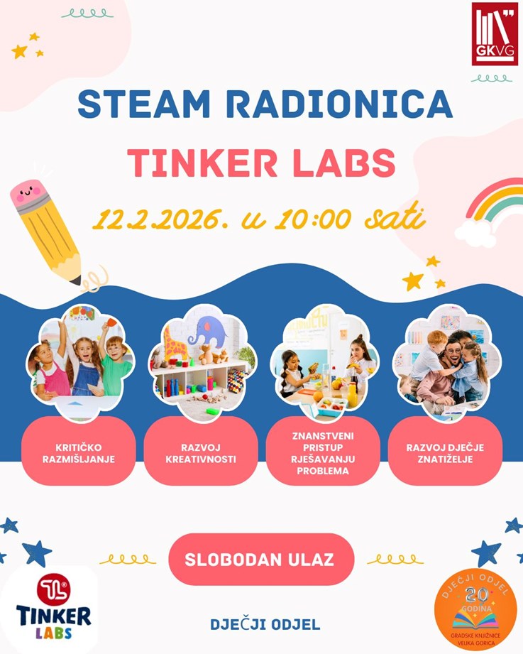 Dječji odjel Gradske knjižnice poziva na besplatno sudjelovanje u Tinker Labs STEAM radionici – suvremenom i inovativnom pristupu učenju prirodnih znanosti kroz praktične pokuse, istraživanje i igru.