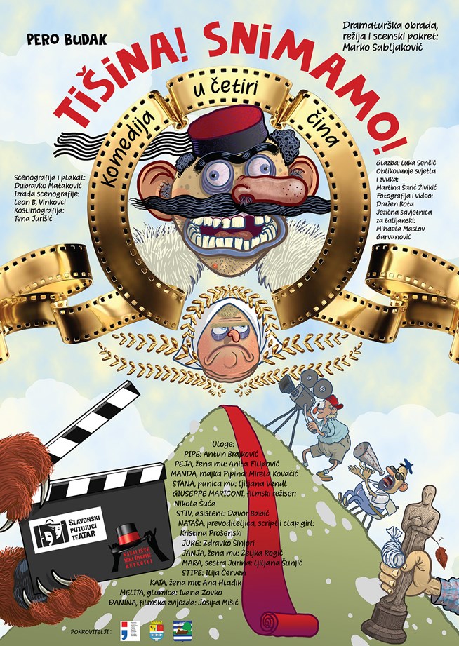 Pero Budak, hrvatski kazališni i televizijski glumac, dramatičar, komediograf, romanopisac, pjesnik i dječji pisac ostavio je u naslijeđe impresivan dramski opus, a na daskama nezaboravne kazališne uspješnice poput Klupka, Teštamenta, Mećave, Na trnu i kamenu i mnogih drugih. Filmsko ostvarenje Mećava prema istoimenoj Budakovoj drami u režiji Antuna Vrdoljaka iz 1977. godine dovoljno govori o snazi njegova dramskog stvaralaštva. Komedija Tišina! Snimamo! napisana 1961. godine prema dostupnim informacijama zaživjela je iste godine u zagrebačkom dramskom kazalištu Gavella kojemu je prvi ravnatelj bio upravo Pero Budak, a istoimeni film snimljen je 1984. godine. Međutim, danas očito dostupan samo u filmskim arhivama. Na sreću, još uvijek ima kazališta koja nekadašnje dramske ostvaraje žele zaigrati na daskama i otrgnuti ih zaboravu. Slavonski putujući teATAR u koprodukciji s Kazalištem "Mika Živković" u sezoni 2025./26. Budakovu komediju Tišina! Snimamo! ponovno vraća pred publiku u osvježenom dramaturškom izdanju i s izvrsnom glumačkom postavom okupljajući glumce s područja najistočnije hrvatske županije. Komedija u kojoj autor pred čitatelja donosi prepoznatljiv humor protkan ličkom ikavicom i vještim karakternim nijansiranjem uloga smještajući radnju u Liku i suprostavljajući selo i grad, odnosno mještane zabitnog sela u brdovitoj Lici i filmsku ekipu iz urbanog gradskog miljea, ali i inozemstva. Jer spoj talijanske i hrvatske produkcijske filmske kuće u kršnu Liku dovodi talijanskog redatelja i poznata glumačka imena. Poznata kako komu. Stanovnicima sela koji se prvi put susreću s kamerama i filmskom ekipom sve je to prilika za ostvarenjem sna. Zaigrati u filmu i postati slavan! Predstava će svojim neospornim humorom kojemu doprinosi slavonski glumački ansambl nastojati približiti Budakov komediografski stil koji osvaja lakoćom, a u svojoj dubini ironizira u duhu prošlih vremena čak i današnji odraz društva. Zbog toga ovaj i njemu slični dramski tekstovi zaslužuju status svevremenskih, ali i ponovni kazališni život i postojanje!