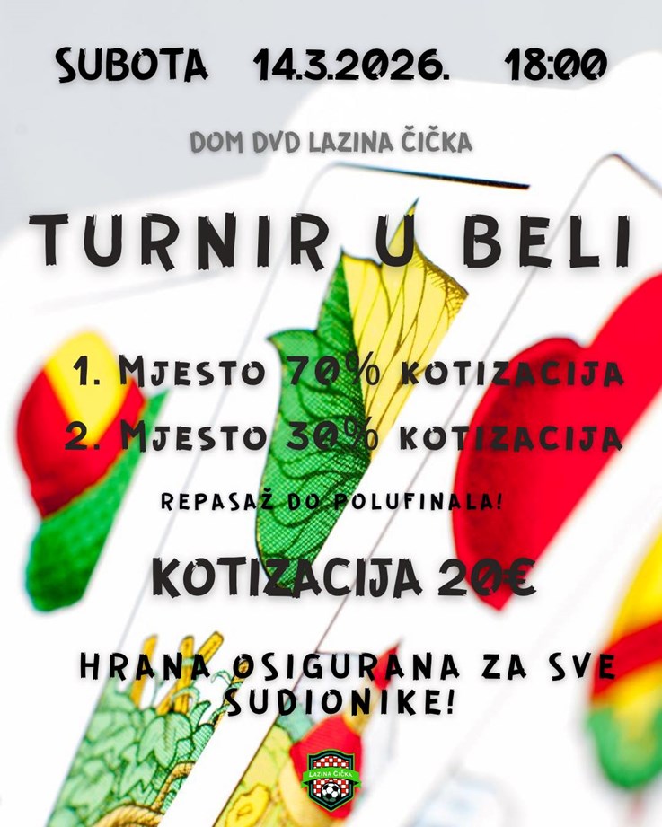 MNK Lazina organizira turnir u beli koji će se održati u subotu, 14. ožujka u Vatrogasnom domu Lazina Čička s početkom u 18 sati.