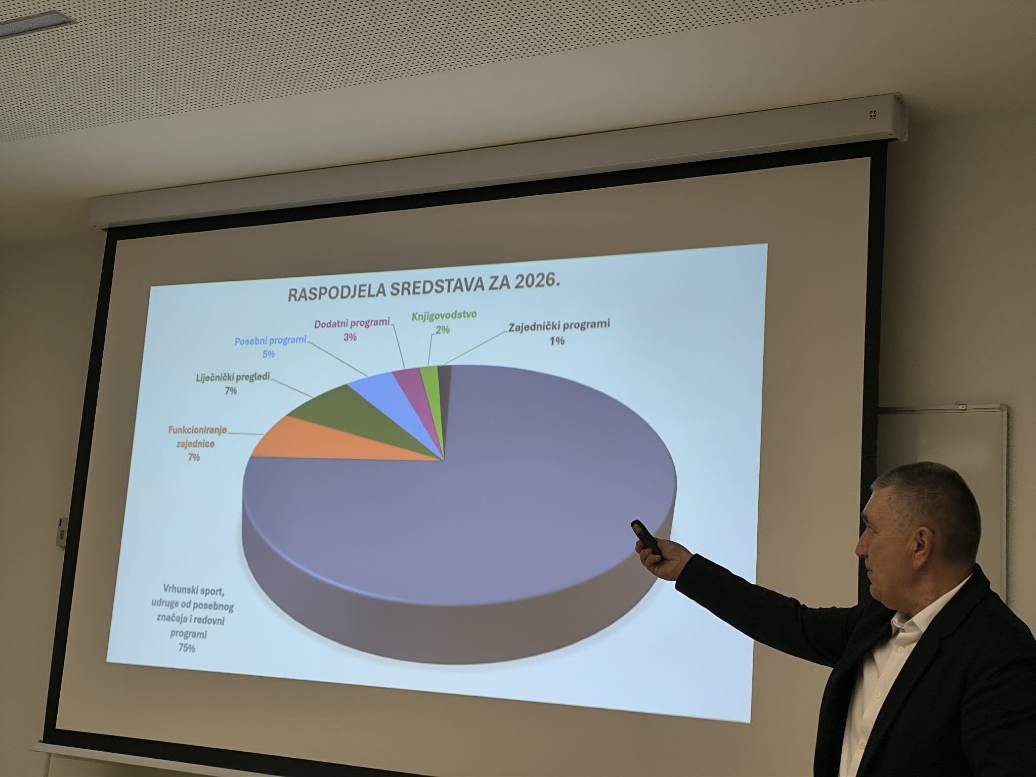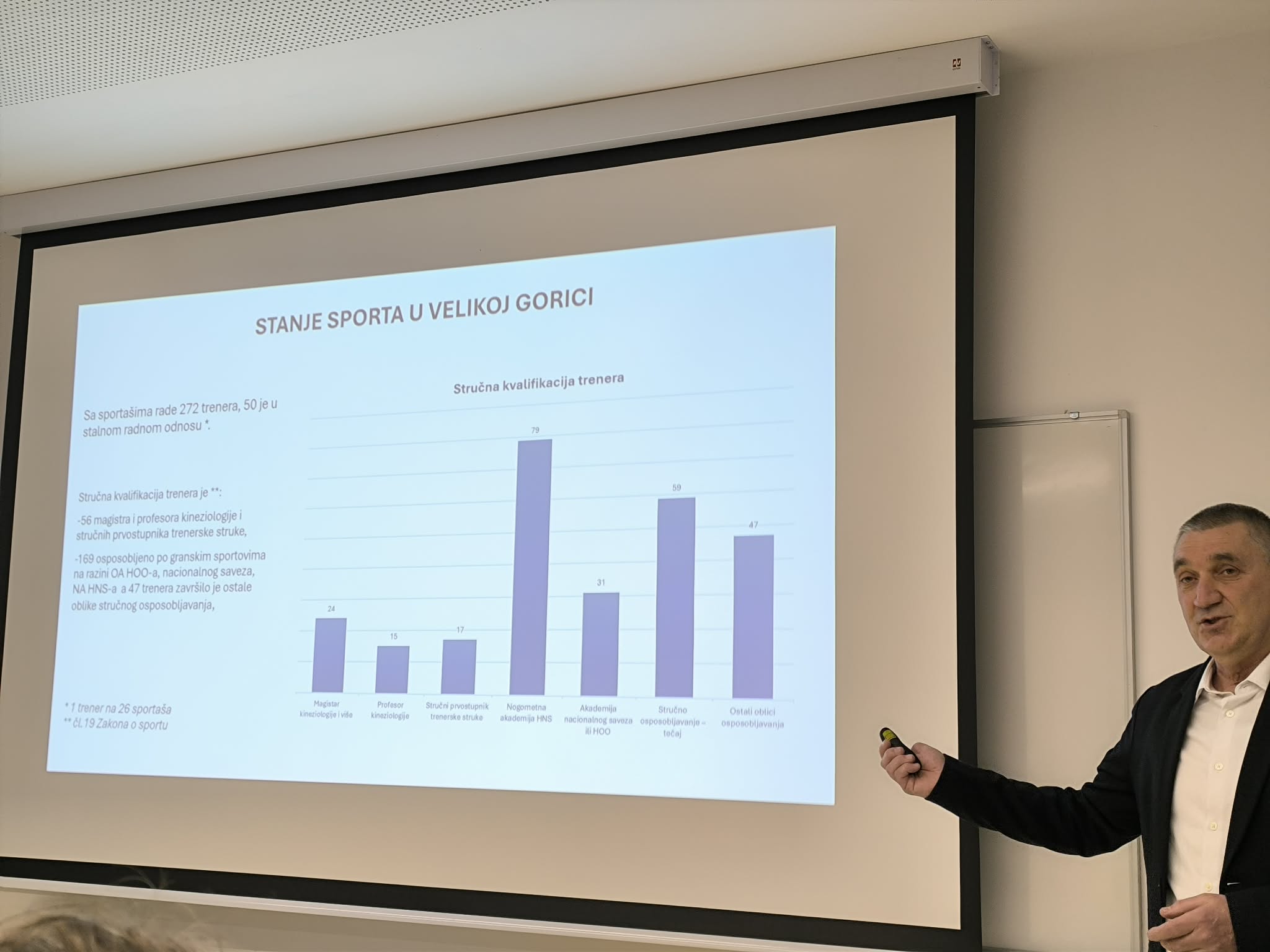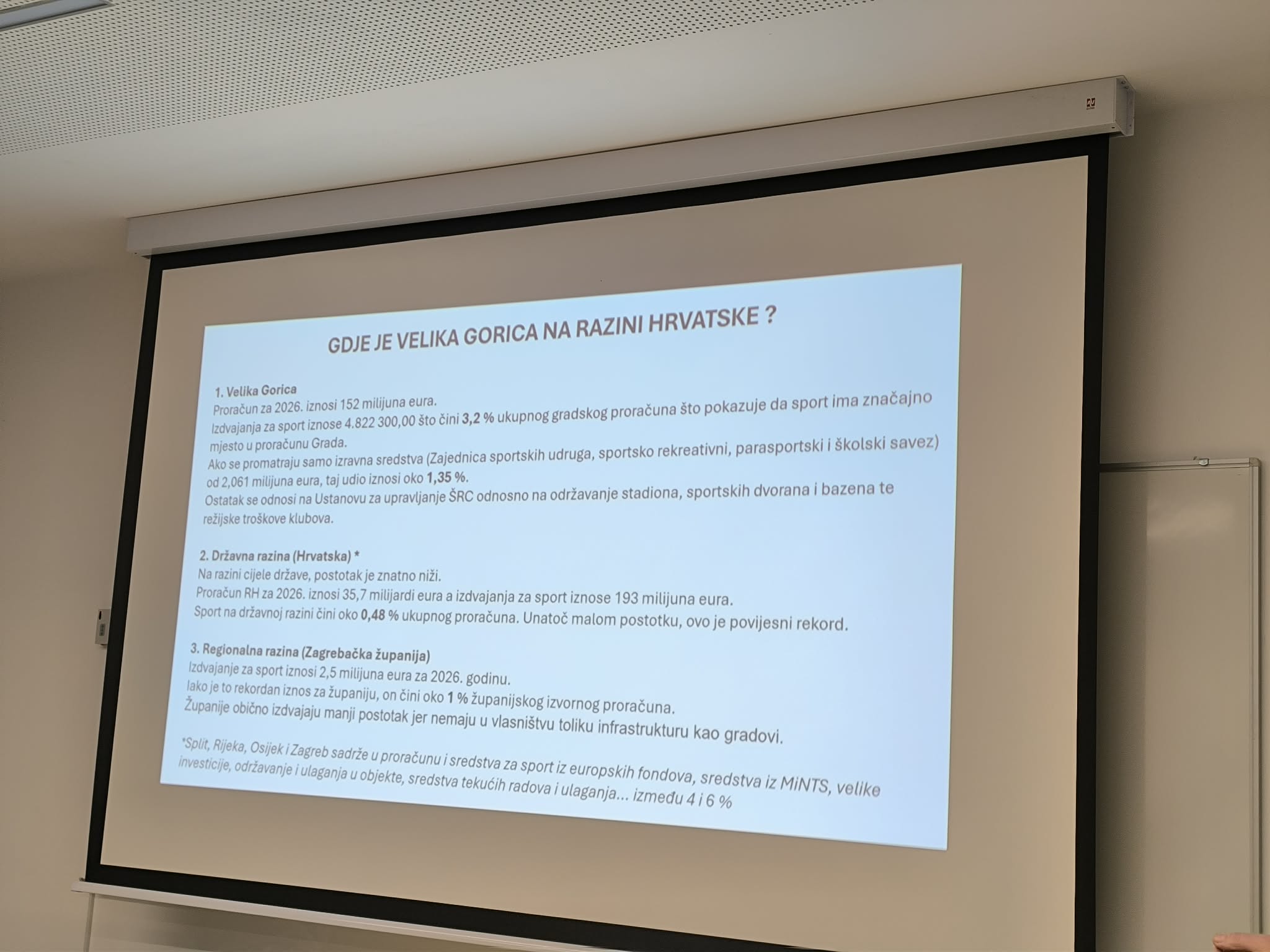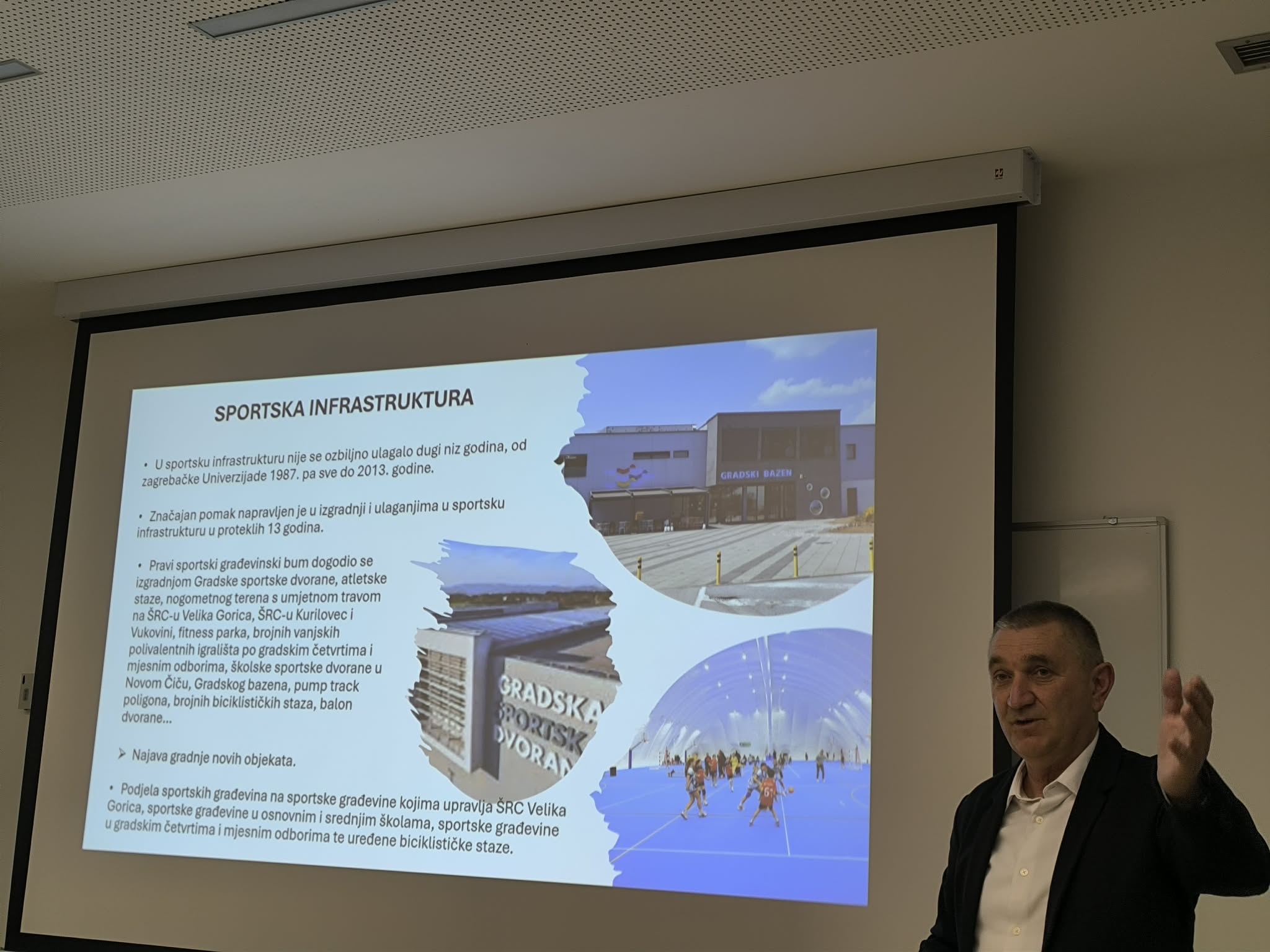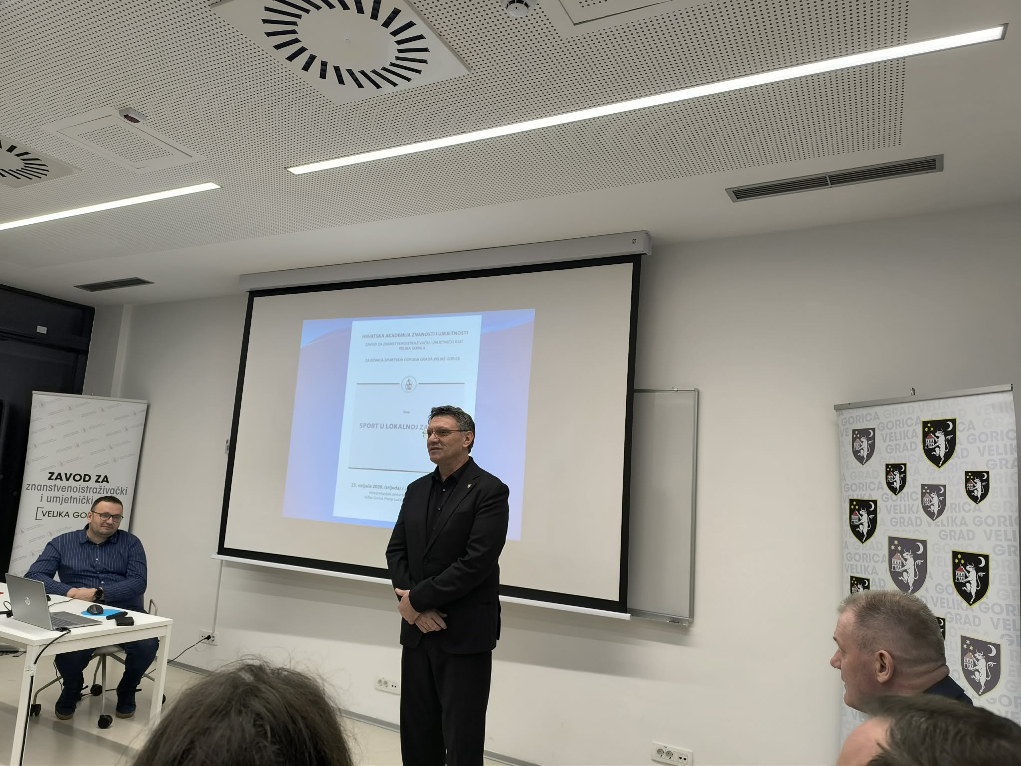 Neven Karas nije samo zamjenik gradonačelnika, nego je i cijenjeni sportski djelatnik i čelnik goričkog rukometnog kluba: "Poštovani akademici, cijenjeni predavači i dragi gosti te dragi kolege, sportski djelatnici i sportaši. Drago mi je da vas mogu pozdraviti u ime našeg gradonačelnika Krešimira Ačkara, kao i u svoje osobno ime. Posebno mi je zadovoljstvo reći kako su ovo okupljanje organizirala dva moja prijatelja, Željko i Goran, a sport u Velikoj Gorici zaista zaslužuje da se o njemu priča i govori češće. Akademik Vretenar je rekao kako Velika Gorica raste i razvija se i možemo s pravom reći kako je Velika Gorica grad djece i mladih ljudi. Ako posvećujemo pažnju našoj djeci i mladim ljudima, nije dovoljno graditi samo vrtiće i škole, trebaju nam i sportski objekti i da se ta djeca bave sportom. U našem gradu djelujemo kroz više Zajednica, a uz Zajednicu udruga tu su i Parasportski savez, Sportsko-rekreativni savez i Školski sportski savez, a u njima djeluje preko 70 različitih udruga, koje okupljaju više od sedam tisuća članova, od čega je više od pet tisuća mladih To su izuzetno respektabilne brojke, a za njih treba osigurati i infrastrukturu i sredstva. Grad Velika Gorica preko ZSUGVG osigurava preko dva milijuna i sto tisuća eura za 2026. godinu. Međutim, osiguravaju se sredstava i preko ustanove za upravljanje sportsko-rekreativnim centrom, a imamo i 16 nogometnih igrališta koja su na upravljanju nogometnih klubova, ali se i djelomično sufinanciraju iz mjesne samouprave. Sve zajedno nešto malo manje od pet milijuna i sto tisuća eura je namijenjeno za sport. To nije sve, ulažemo i u infrastrukturu, nedavno smo otvorili novu sportsku dvoranu, gradonačelnik potpisuje ugovore za sredstva od 65 milijuna eura za rekonstrukciju i gradnju dvije nove škole. Ono što je za nas sportaše jako bitno, u te dvije škole, u Kurilovcu i i u Rakarju - Pleso grade se i dvije dvorane, koje će biti trodijelne. Dodjeljuju se za dvodijelne dvorane, ali smo ih odlučili sufinancirati pa kad se već grade neka budu trodijelne i da ih mogu koristiti svi sportaši, a ne samo djeca."