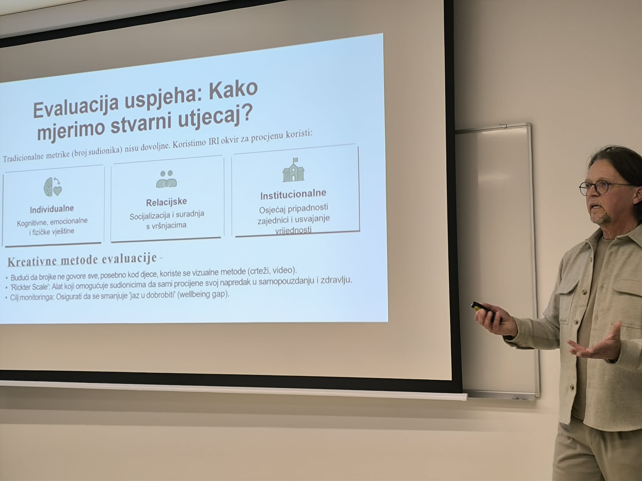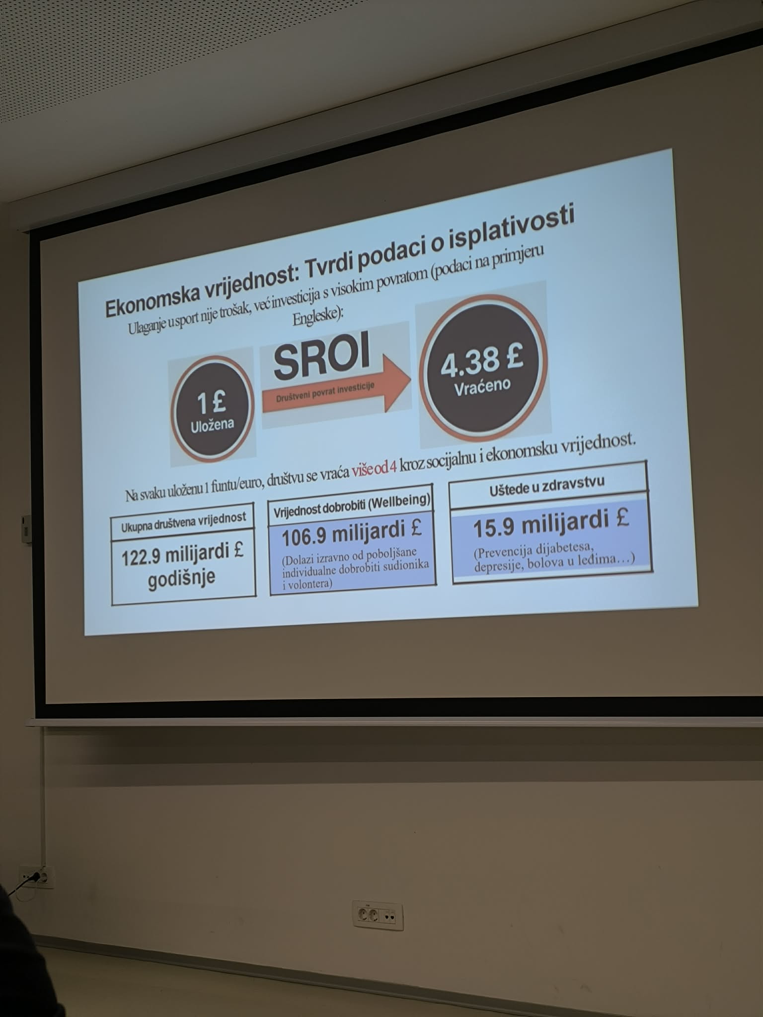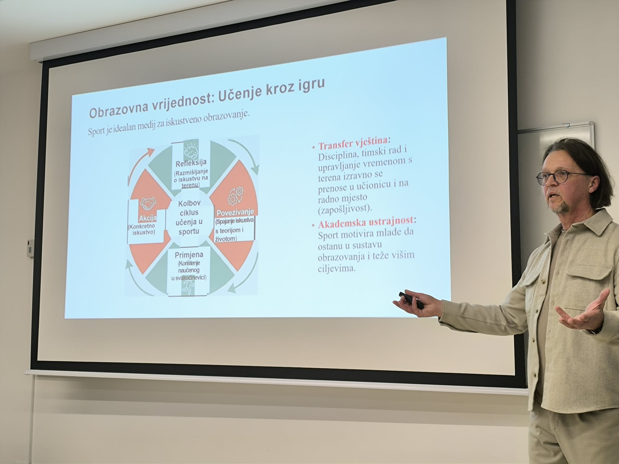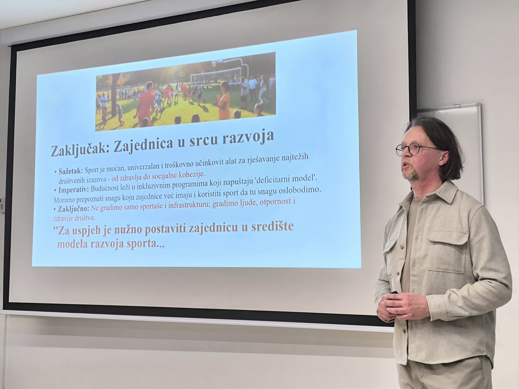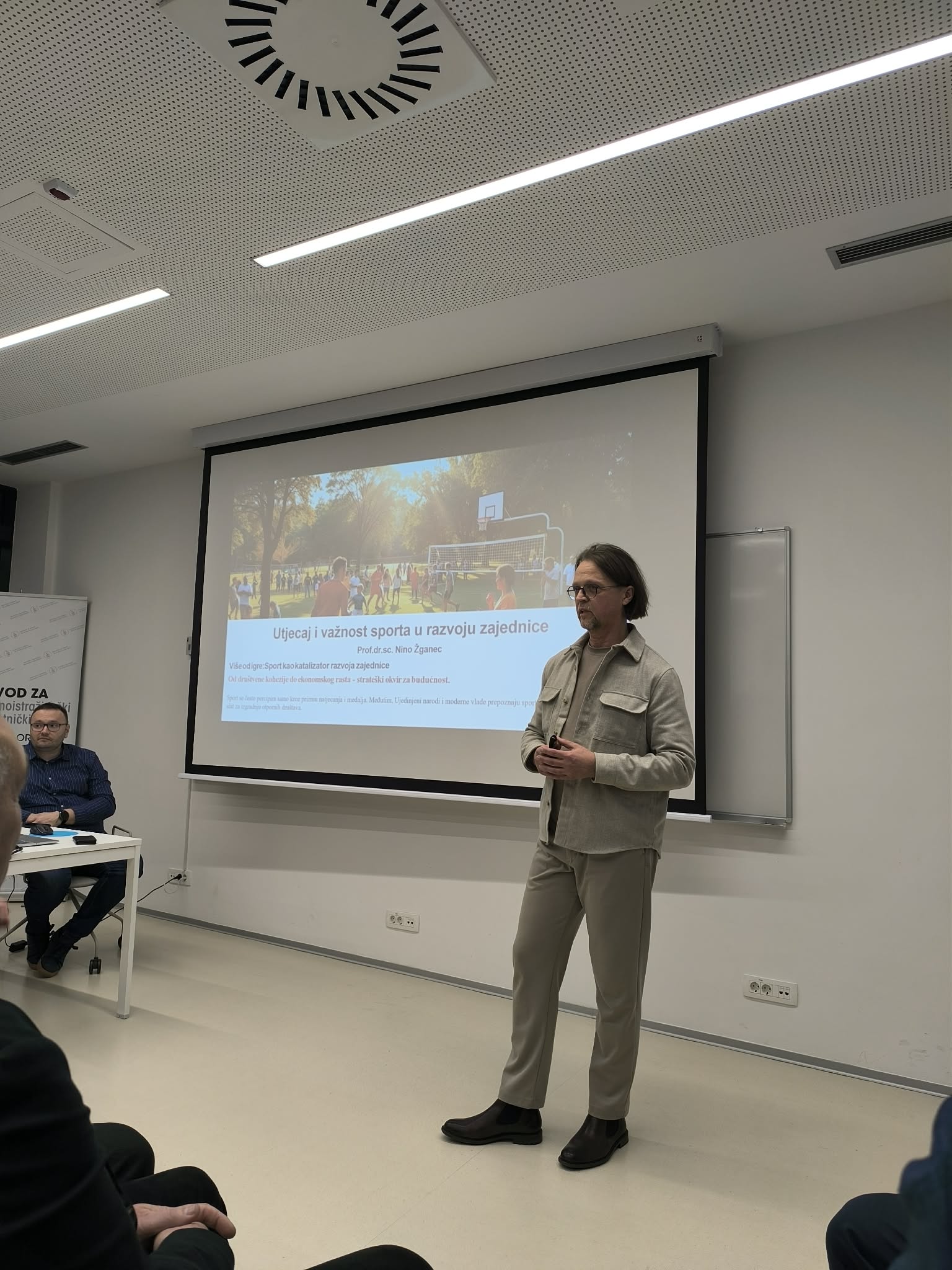 Prvo predavanje održao je prof. dr. sc. Nino Žganec s Pravnog fakulteta Sveučilišta u Zagrebu pod nazivom Utjecaj i važnost sporta u razvoju zajednice, gdje se izvrsnim primjerima osvrnuo na konkretne benefite koje sport ima u razvoju i napretku društva u kojem živimo.