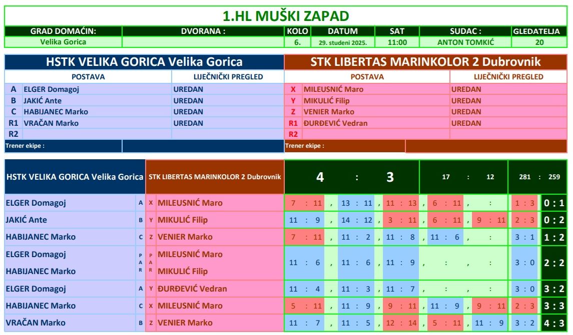 Na savršen način zaključili su stolnotenisači HSTK Velika Gorica prvi dio sezone u 1. HL Zapad, dramatičnom domaćom pobjedom nad drugom ekipom STK Libertas Marinkolor iz Dubrovnika, koja je do ovog dvoboja također bila neporažena! Velikogoričani su tako zadržali maksimalan učinak te su imali puno razloga za zadovoljstvo prije zaslužene zimske pauze.