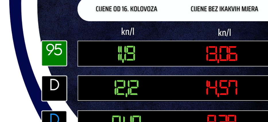 Cijene naftnih derivata određene temeljem predmetne Uredbe dodatno će se sniziti u odnosu na sada važeće, pa će od utorka nove cijene biti: benzin 11,19 kuna po litri (smanjenje za 0,11 kuna), dizel 12,12 kuna po litri (smanjenje za 0,02 kuna) i plavi dizel 8,49 kuna po litri (smanjenje za 0,01 kuna).