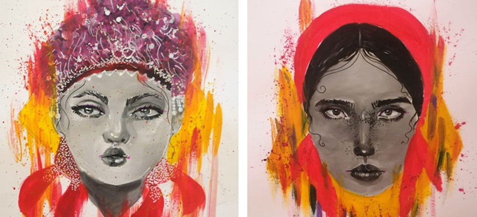 Inspiraciju za ovu izložbu Dina pronalazi u ljubavi prema starim običajima i odjevnim predmetima što je pokazala već pri odabiru diplomskog rada pod naslovom Turopoljske narodne nošnje. Radovi su napravljeni akrilnim bojama a prikazuju razna ženska oglavlja tj. pokrivala za glavu koja su nosile žene u našem kraju. Svako lice djevojke ili žene simbol je modernog svijeta, a oglavlje starog. Cilj je bio spojiti ta dva svijeta te time istaknuti da je u današnje vrijeme vrlo važno očuvati narodnu nošnju kao vrijednu kulturnu baštinu naših predaka. Kulturna baština nam pokazuje kako su ljudi nekada imali druge vrijednosti življenja i kreativnog izražavanja koja mi danas nemamo ali isto tako ih ne smijemo zaboraviti. Naše turopoljske nošnje su mala remek djela čiji se dizajn može prepoznati u širokom spektru modernih odjevnih predmeta . Starina u sebi čuva takozvano jednostavno shvaćanje emocija koje se ponajviše vidi u bojama te njihovoj simbolici te ukazuju na jedan život bez opterećenja medijima i suvišnim informacijama koje donosi današnji život.