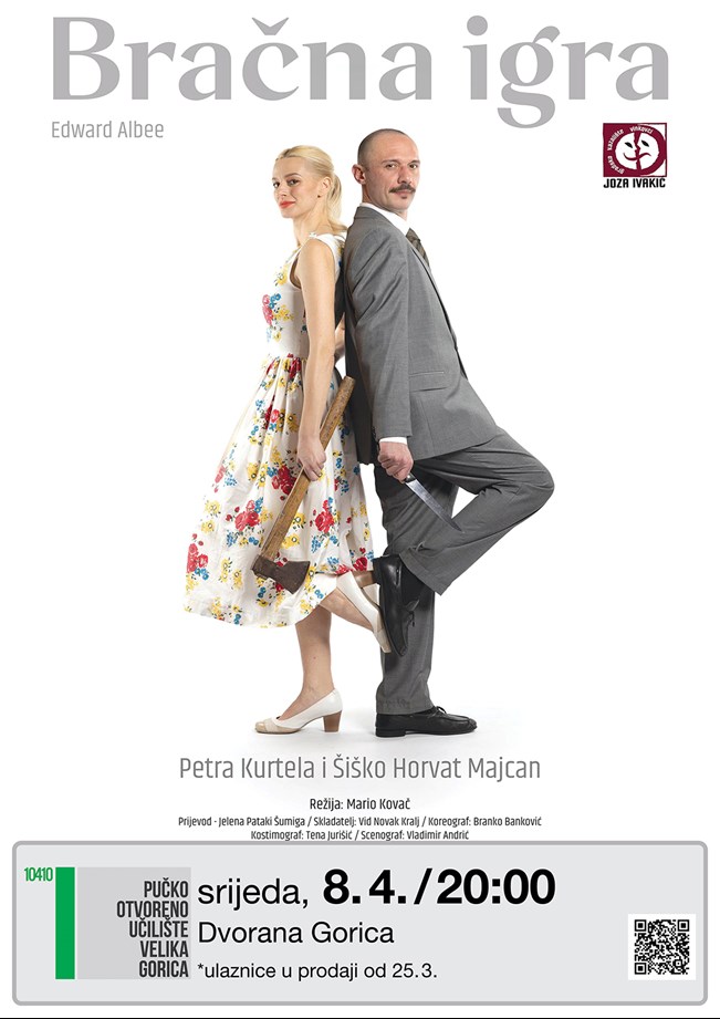 U Dvorani Gorica, u srijedu 8. travnja s početkom u 20 sati, na pozornicu stiže predstava „Bračna igra“ u izvedbi Gradskog kazališta „Joza Ivakić“ iz Vinkovaca. Riječ je o toploj komediji poznatog američkog autora Edwarda Albeeja koja gledatelje vodi u intimni svijet bračnog para suočenog s vlastitim odnosom nakon godina zajedničkog života.
