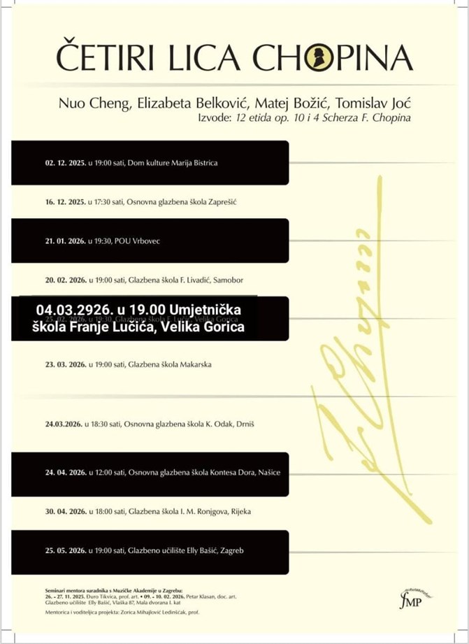 Nuo Cheng, Elizabeta Belković, Matej Božić i Tomislav Joć u srijedu, 4. ožujka 2026. u 19 sati u Koncertnoj dvorani Škole izvest će neka od najljepših, ali i u svakom smislu najtežih djela poljskog pjesnika klavira Frédérica Chopina - ciklus 12 etida, op. 10 te 4 Scherza. Ulaz na koncert je slobodan.
