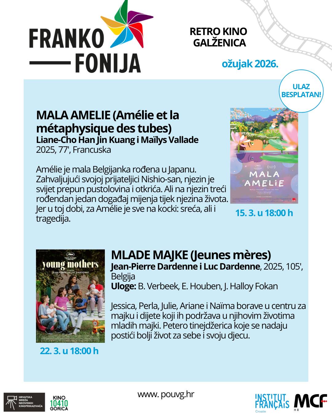 Kino mreža i MCF Hrvatska u suradnji s Francuskim institutom organiziraju i ove godine Dane Frankofonije. Program donosi recentne distribucijske filmske naslove iz frankofonih zemalja, a održavat će se i u Retro kinu Galženica.