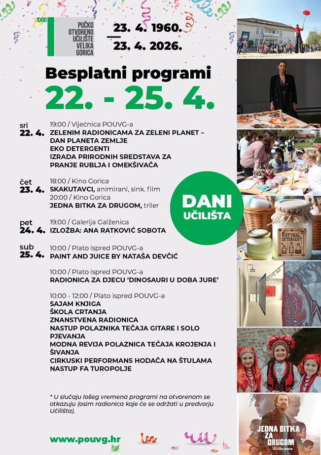 -Pozivamo sve građane da nam se pridruže i s nama proslave 66 godina rada, stvaranja i zajedništva. U slučaju lošeg vremena programi na otvorenom se otkazuju (osim radionica koje će se održati u predvorju Učilišta) - poručili su iz Pučkog otvorenog učilišta.