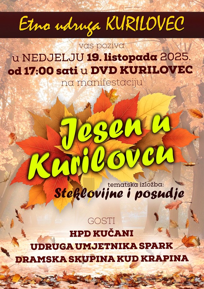 Vrijedni članovi Etno udruge Kurilovec i ove su se godine potrudili organizirati manifestaciju „Jesen u Kurilovcu” koja će se održati u nedjelju 19. listopada od 17:00 sati u u prostorijama DVD-a Kurilovec, Horvatova 57.