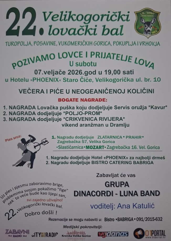 Lovkinje, lovci i ostali ljubitelji lova - Lovačko društvo „Srna“ priprema tradicionalni, 22. Velikogorički lovački bal koji će se održati 7. veljače u Hotelu „Phoenix“ u Starom Čiču.