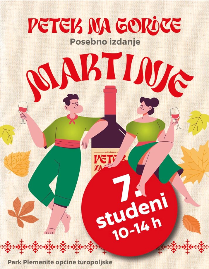 Prvi petak u mjesecu rezerviran je za dobro poznatu manifestaciju „Petek na Gorice“. U parku Plemenite općine turopoljske 7. studenog od 10:00 do 14:00 sati sati očekuju vas naši domaći proizvođači na Mljac placu te modni detalji s turopoljskim motivima na Art placu.