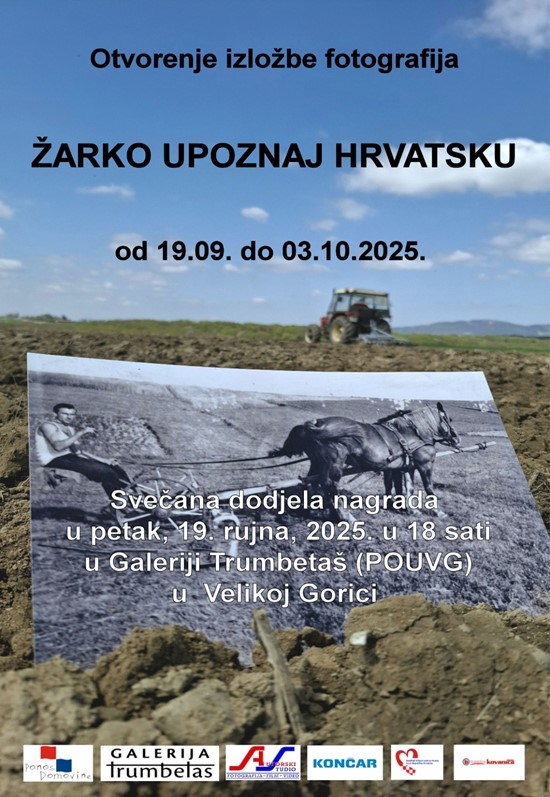 U organizaciji Udruge Ponos Domovine i Autorskog studia ffv u Galeriji Trumbetaš, u petak 19. rujna otvara se izložba fotografija nastalih u sklopu ovogodišnjeg fotografskog natječaja „Žarko upoznaj Hrvatsku“. Otvorenje je u 18:00 sati.