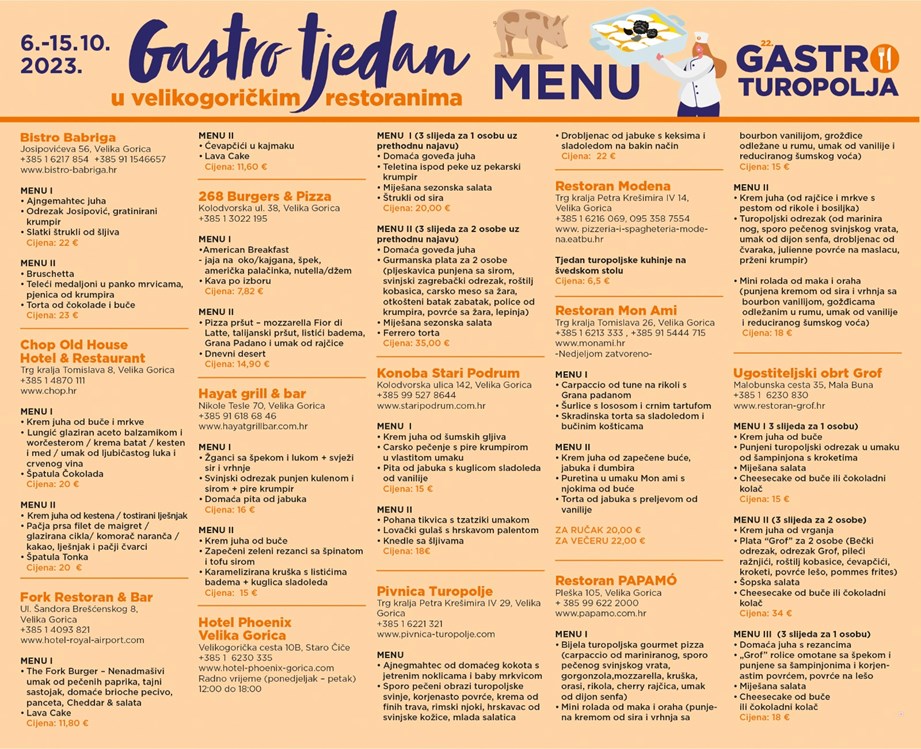 Također restoran Modena ima i ponudu švedskog stola s temom turopoljske kuhinje po cijeni 6,5 eura po osobi. Ponuda je uistinu raznolika i svatko će pronaći ponešto za svoje nepce, nek su restorani u menije utkali domaći turopoljski štih i "jesensku" ponudu jela, a detaljan popis jela pogledajte na slici ispod.