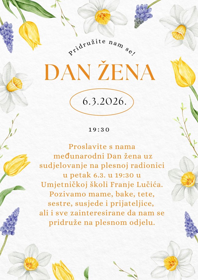 Plesni odjel Umjetničke škole Franje Lučića poziva mame, bake, tete, sestre, susjede i prijateljice na plesnu radionicu koja će se održati u petak 6.3. uoči Međunarodnog dana žena.