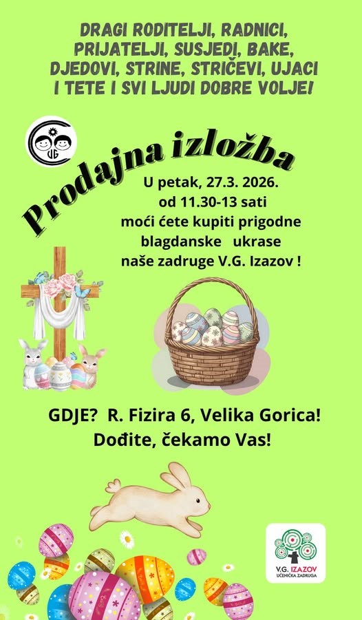 Učenici i njihovi učitelji Centra za odgoj i obrazovanje Velika Gorica pozivaju roditelje, djedove, bake, prijatelje i sve zainteresirana da posjete uskrsnu prodaju proizvoda učeničke zadruge, a koja će se održati u petak 27. ožujka od 11:30 do 13:00 sati u školskom holu u prizemlju Centra.
