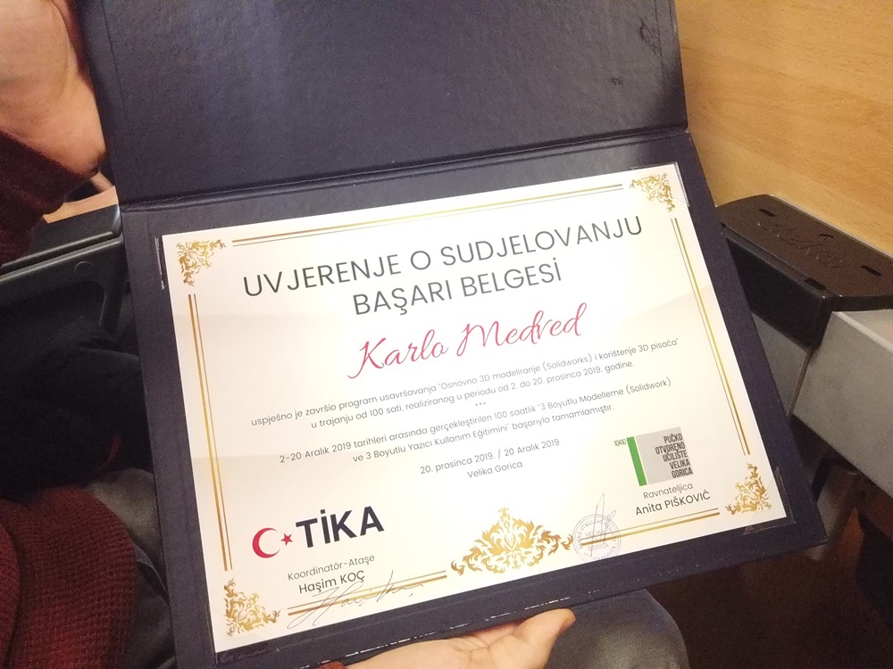 U Pučkom otvorenom učilištu Velika Gorica svečano su podijeljena uvjerenja o sudjelovanju polaznicima edukacijskog programa ‘Osnovno 3D modeliranje i korištenje 3D printera’. Ovaj program u periodu od 2. do 20. prosinca ostvaren je kroz suradnju POUVG-a i Turske agencije za suradnju i koordinaciju (TIKA).