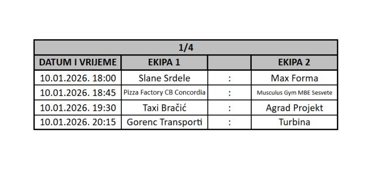 Uzbudljiva subotnja borba za polufinala počinje od 18 sati, okršajem ekipa Slane srdele i Max forma. Od 18.45 sati na parket srednjoškolske dvorane izlaze Pizza Factory - CB Concordia i Musculus Gym & MBE Sesvete, dok će od 19.30 sati igrati Taxi Bračić i Agrad Projekt. Na kraju programa još jedna malonogometna 'poslastica', dvoboj momčadi Gorenc transporti i Turbina!