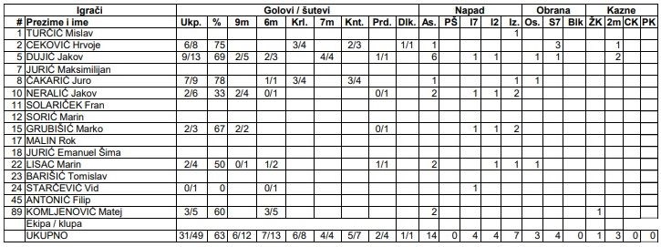 Završilo je 27:31, uz devet komada ponovno raspucanog Jakova Dujića. I ovaj put su mu se priključili i Juro Čakarić sa sedam golova i kapetan Ceković, koji je dodao šest, uz sedam obrana Marina Sorića i četiri Mislava Turčića. Obojica us obranila i po jedan sedmerac te su vratari opet bili važan dio novog uspjeha.