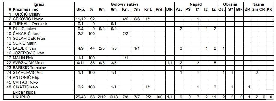 Laljek je ostao na četiri pogotka, iz devet pokušaja, dok je Svržnjak za četiri gola trebao čak 11 šuteva. Jakov Dujić je ostao na 'nuli', iz četiri pokušaja prema suparničkim vratima...