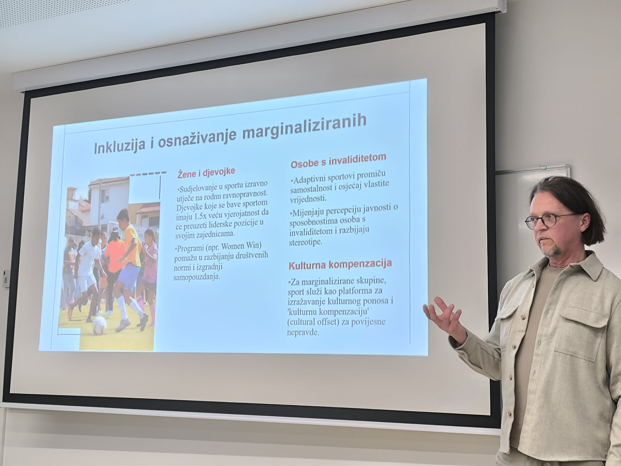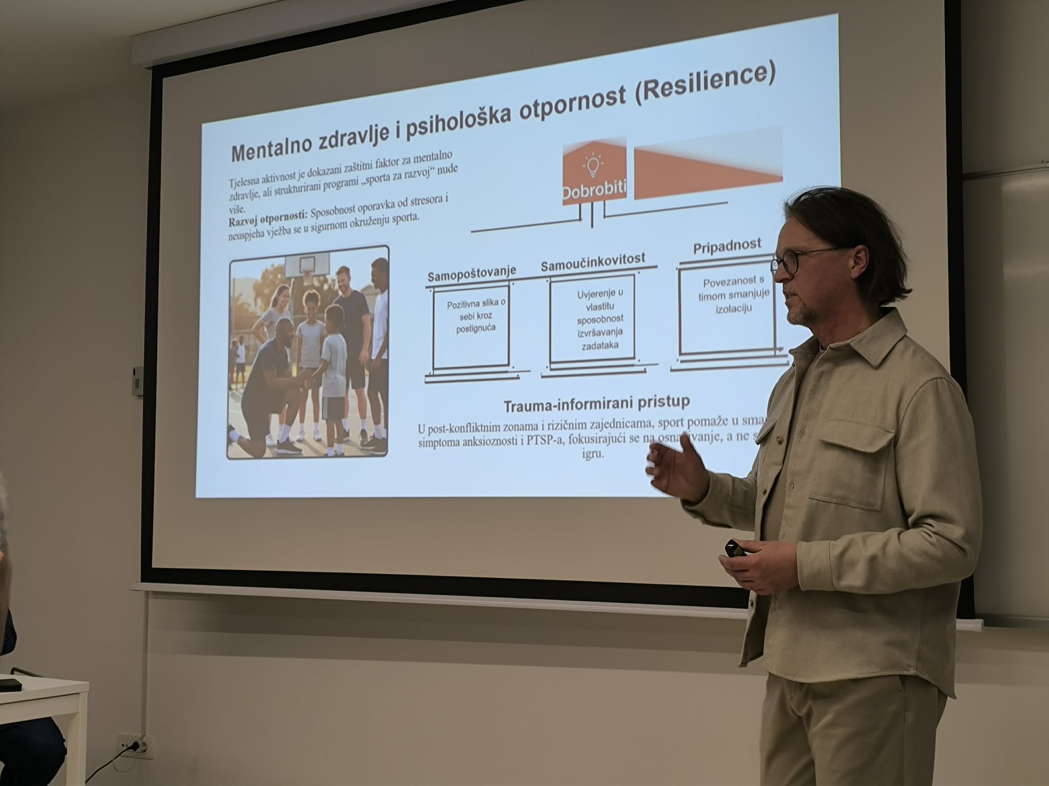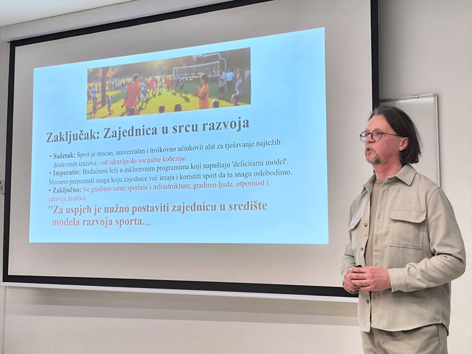 Prvo predavanje održao je prof. dr. sc. Nino Žganec s Pravnog fakulteta Sveučilišta u Zagrebu pod nazivom Utjecaj i važnost sporta u razvoju zajednice, gdje se izvrsnim primjerima osvrnuo na konkretne benefite koje sport ima u razvoju i napretku društva u kojem živimo.