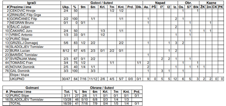 Predvodio ga je Lucian Bura s osam golova iz 12 pokušaja, a dobro ga je pratio i Domagoj Grizelj s pet pogodaka, uz samo jedan promašaj, dok je briljirao i Tomislav Sladoljev s 13 obrana i gotovo 50 posto uspješnosti!