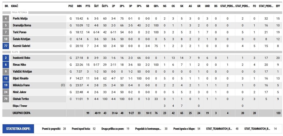 Mladi 19-godišnji Rimac već se u prvoj utakmici iskazao s 15 koševa i sedam skokova. Odličan je bio i Pavao Turić s 14 poena, pet skokova i čak sedam ukradenih lopti, dok je Borna Dramalija dodao 12 koševa za samo deset minuta, jer nije niti bilo potrebe za većom minutažom prvog šutera Gorice. Dvoznamenkasti učinak imali su još Rinaldo Bljaić, koji je uz 11 poena imao i pet skokova, a istaknuo se i Roko Ivanković s osam koševa, 14 skokova i sedam asistencija.