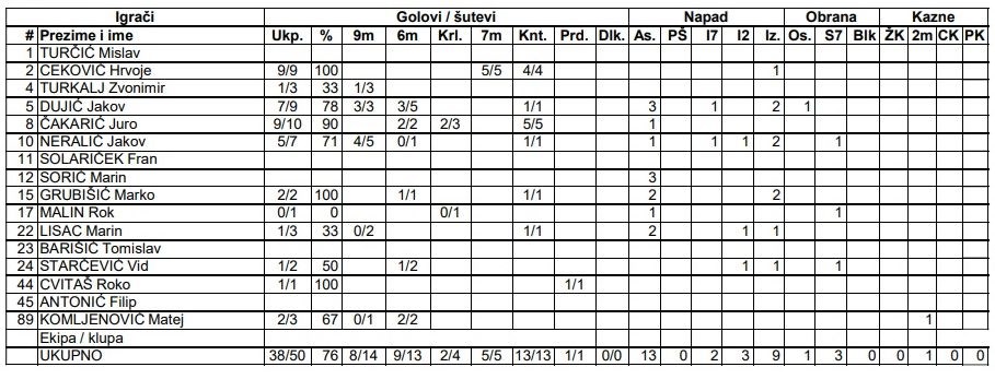 Briljirali su Hrvoje Ceković i Juro Čakarić, svaki s devet pogodaka, dok je raspucan bio i Jakov Dujić, koji je precizan bio sedam puta. Kao pravo pojačanje pokazao se i Jakov Neralić s pet golova, a dva komada dodali su i novopridošli Marko Grubišić i Matej Komljenović. U listu strijelaca upisao se također i Marin Lisac, kao i Roko Cvitaš, još jedan izdanak domaće rukometne škole.