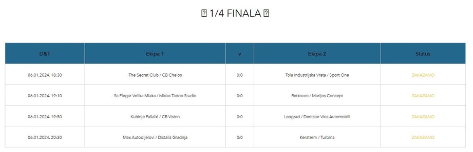 Retkovec od 15 sati igra protiv ekipe Marijos Koncept, dok će CB Vision od 15.40 sati u okršaj s ekipom Kuhinje Pašalić. Leograd igra protiv ekipe Dentstar Vios Automobili (16.20 sati), Max Autodijelovi od 17 sati igraju protiv Distalis Gradnje, dok će o posljednjem mjestu u četvrtfinalu odlučiti Turbina i Keraterm (17.40 sati).