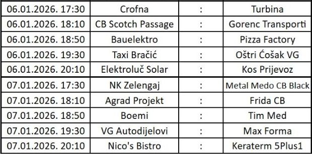 Na Sveta tri kralja program otvaraju Crofna i Turbina, od 17.30 sati, dok se od 18.10 sati igra veliki derbi ekipa Gorenc transporti i CB Scotch & Passage. Slijedi dvoboj momčadi Bauelektro d.o.o i Pizza Factory - CB Concordia, od 18.50 sati, a izuzetno zanimljiv bi trebao biti i okršaj Taxi Bračić Velika Gorica - Oštri ćošak VG, od 19.30 sati.