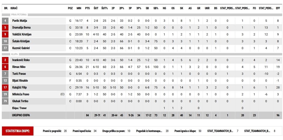 Sin Slavena Rimca se na kraju zaustavio na 21 poenu, dok je Kalajžić imao double-double učinak od 16 koševa i čak 14 skokova. Dvoznamenkasti učinak imali su još Ivanković i Kristijan Validžić, koji su ubacili svaki po deset koševa.