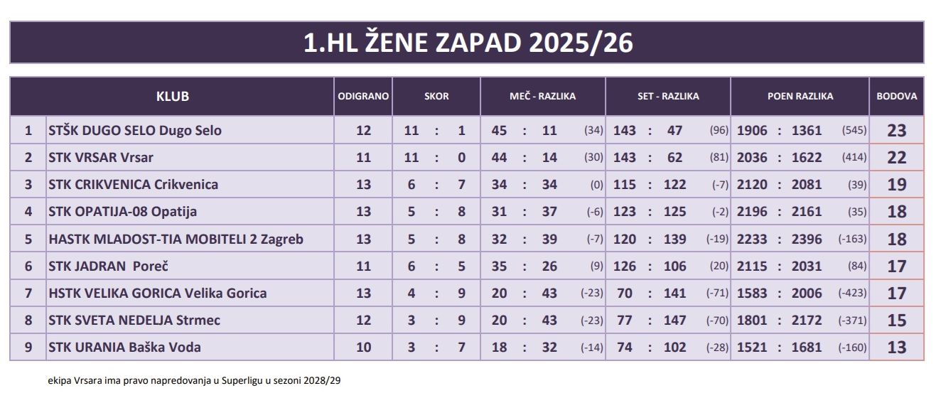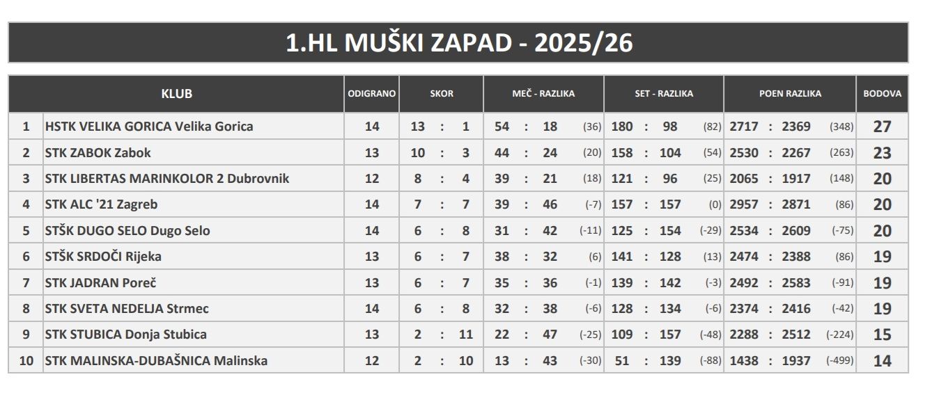 HSTK Velika Gorica je na vrhu 1. HL Zapad s 13 pobjeda i jednim porazom, a u idućem kolu, ove subote, dečki će prvo gostovati kod STŠK Srdoči u Rijeci pa kod STK Jadran u Poreču.