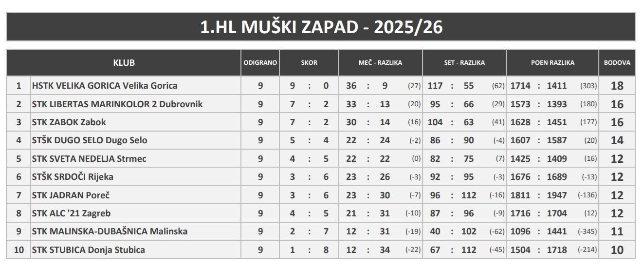 Na savršen način zaključili su stolnotenisači HSTK Velika Gorica prvi dio sezone u 1. HL Zapad, dramatičnom domaćom pobjedom nad drugom ekipom STK Libertas Marinkolor iz Dubrovnika, koja je do ovog dvoboja također bila neporažena! Velikogoričani su tako zadržali maksimalan učinak te su imali puno razloga za zadovoljstvo prije zaslužene zimske pauze.